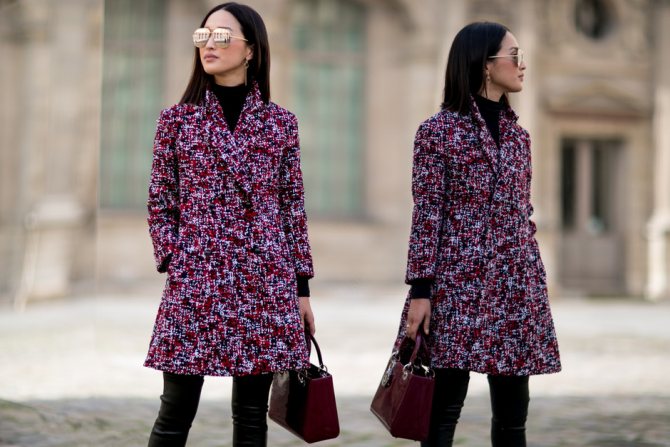 - С водолазкой хорошо смотрится слегка зауженная модель штанов, под которыми надеты покрытые лаком туфли. Цвет выбирается предпочтительно темный для всех элементов гардероба. Поверх надевают пальто с откладывающимся воротом макси или миди длины. Вариации расцветок верхней одежды: бледно-серая, голубая, белая с черным принтом в виде мелких крапинок.