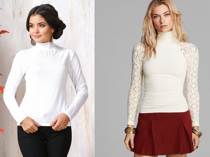 - девушки при желании могут подчеркнуть достоинства зоны декольте, если водолазка имеет увеличенный круглый вырез.