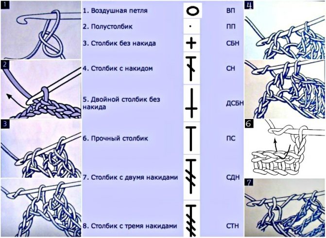 Столбик без накида состоит из воздушной и рабочей петель, провязанных вместе. Такой вид вязания образует самое плотное полотно.