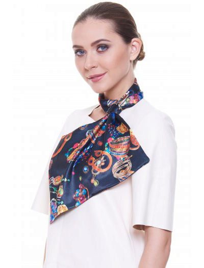 Платок на шее самодостаточен и не терпит дополнительных украшений: цепочек, бус, колье. Они разрушат нежность образа. Максимум, что допускается, – надеть на узел косынки красивую брошь.