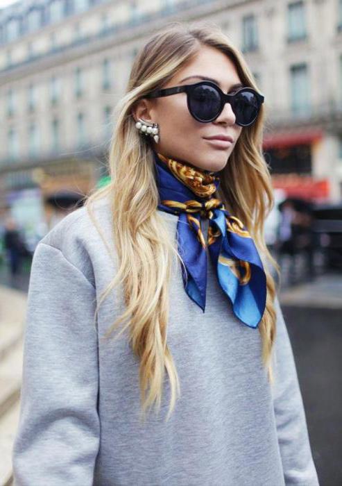 Французский платок универсален, его допустимо носить на улице и в помещении. Он сочетается с платьями любых фасонов, туникой, блузкой, рубашкой, брючным либо юбочным костюмом, водолазкой, джемпером или курткой. Подобрав фактуру и оттенок материала для шарфа, можно оживить или уравновесить наряд, внести оригинальную нотку. Не сочетается модный атрибут лишь с вещами в спортивном стиле.