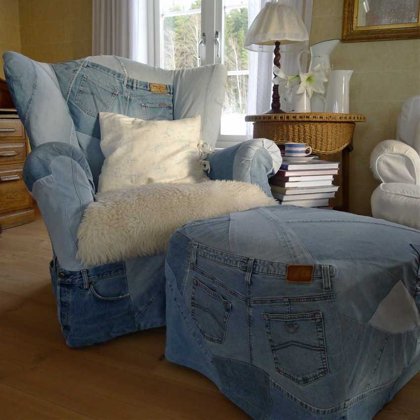 - диванные подушки из… карманов от джинсов, сшитых друг с другом в хаотичном порядке;